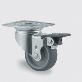 Otočné kolo s brzdou kola, Vidlice vyrobena z ocelového výlisku, pozinkováno, dvojité kuličkové ložisko v otočné hlavě, střed nýtován, uchycení s plotýnkou.